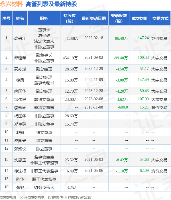 永兴材料近半年内的董监高及核心技术人员增减持详情如下: